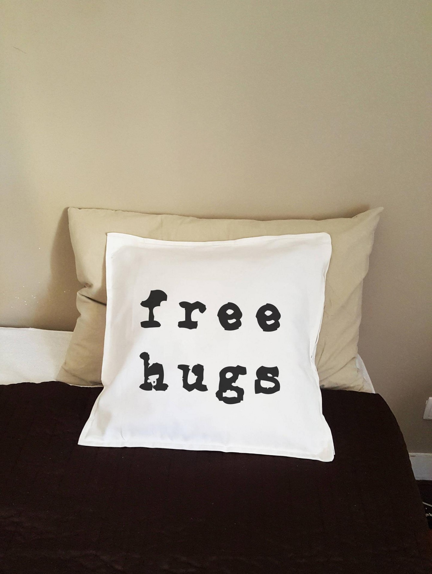 Almofada branca com texto 'free hugs' em preto sobre cama com almofada bege