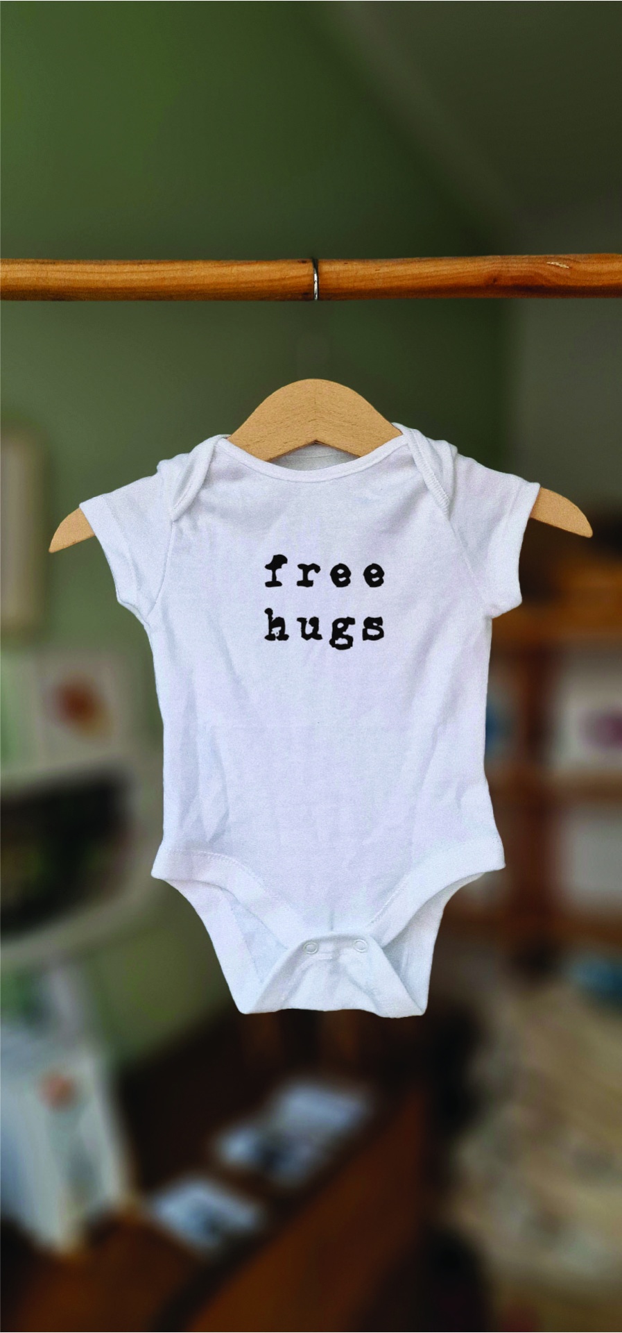 Body branco de bebé em algodão com texto 'free hugs' pendurado num cabide de madeira