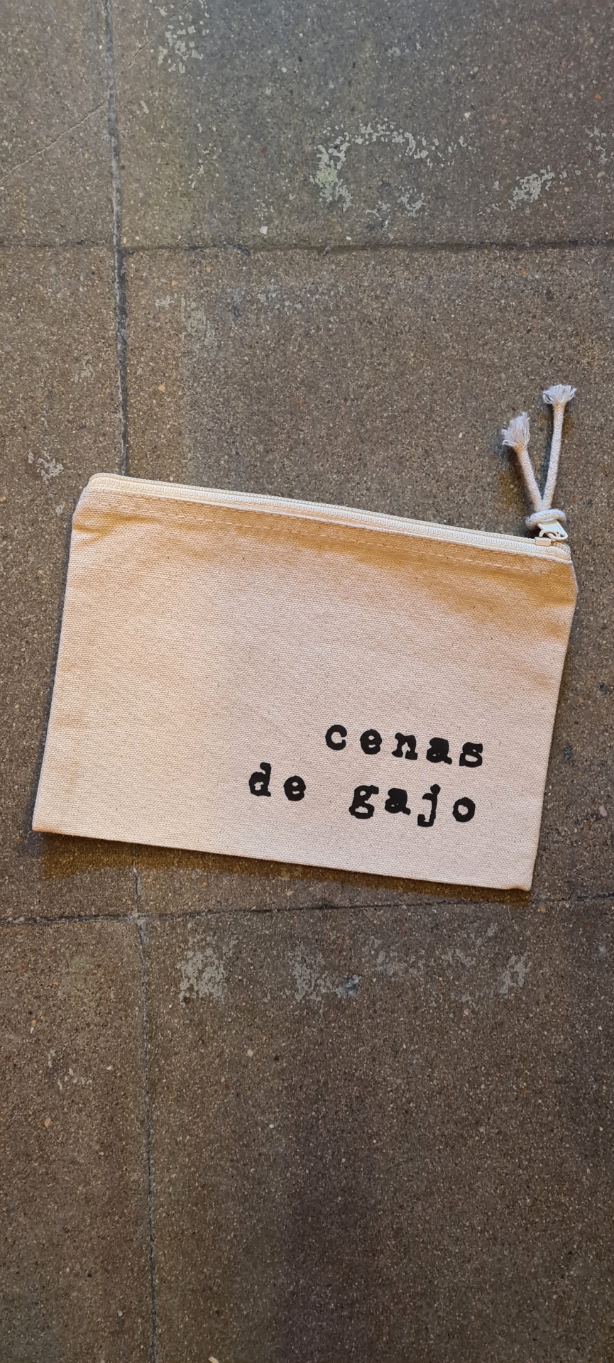 Bolsa de tecido algodão cru com fecho e texto 'cenas de gajo' preta