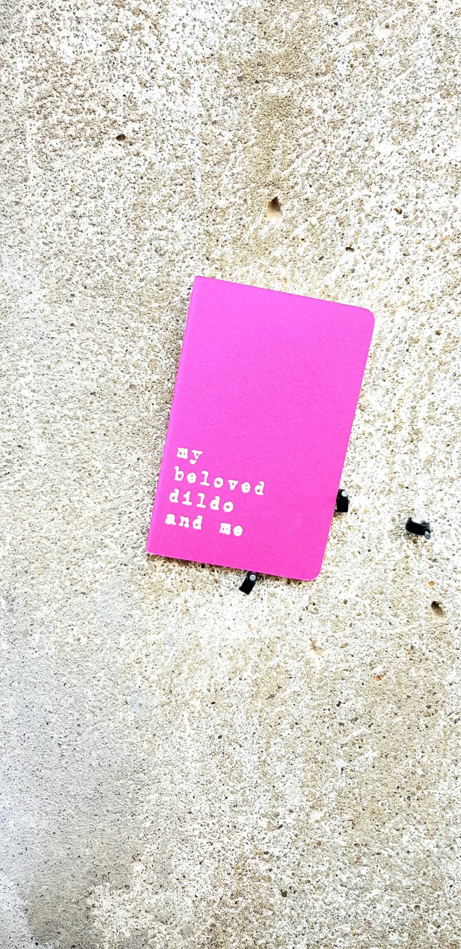 • Caderno cor-de-rosa com texto branco na capa sobre parede clara texturizada