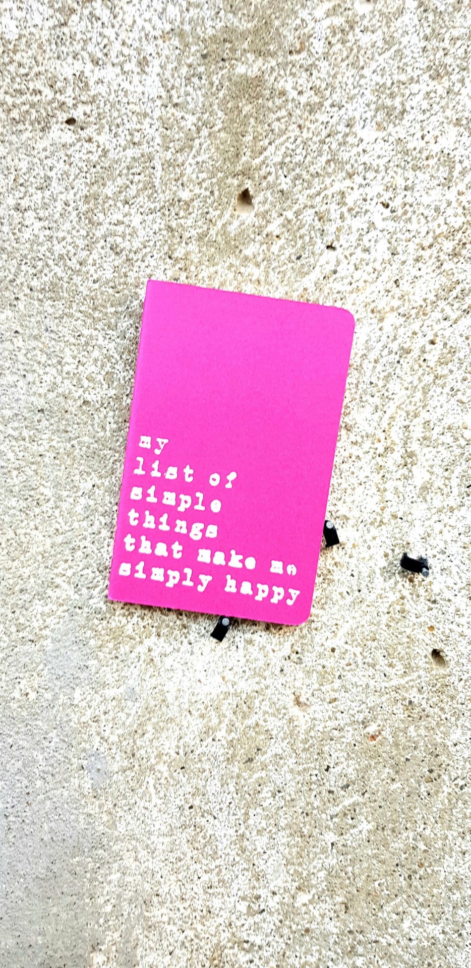 • Caderno rosa com texto branco sobre uma parede bege texturada