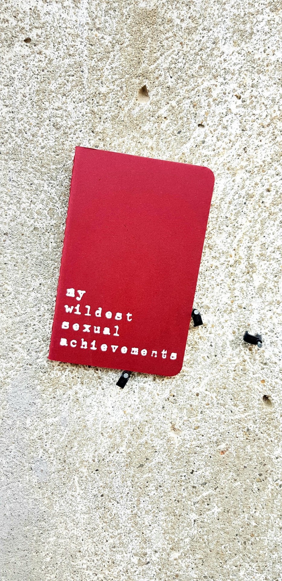 Caderno vermelho com texto branco sobre superfície de cimento