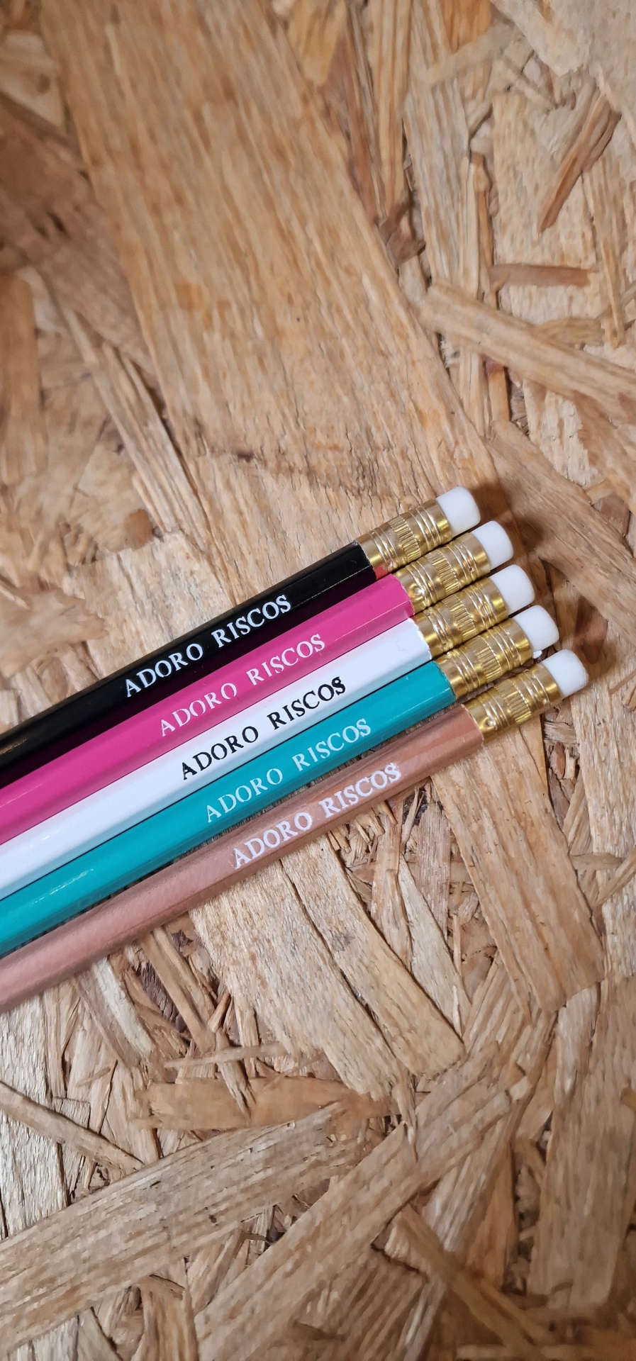 Lápis 'adoro riscos' (um lápis) 3,00 € Desconto de %. IVA incluído. Partilhar Cor Branco Preto Azul Turquesa Cor de Rosa Madeira Comprar Contactar 16 unidades em stock - Lápis 'adoro riscos' - Um lapis Viarco com frase personalizada - Existem em branco, preto, cor de rosa, azul turquesa e madeira, de acosro com o stock disponível Tags lápislápiz personalizadocreativityadoro eiscosriscodesenhardesenhoriscarlapiz viarco Características