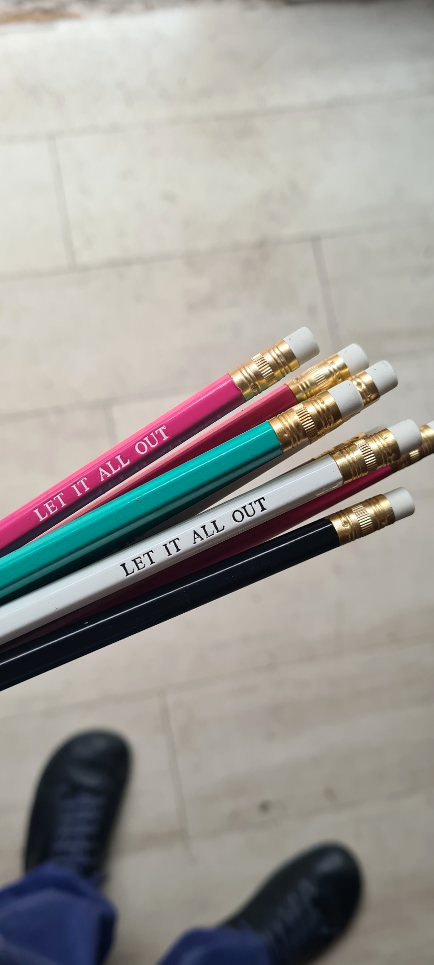 Lápis 'let it all out' (um lápis) 3,00 € Desconto de %. IVA incluído. Partilhar Cor Branco Preto Azul Turquesa Cor de Rosa Madeira Comprar Contactar 14 unidades em stock - Lápis 'let it all out' - Um lapis Viarco com frase personalizada - Existem em branco, preto, cor de rosa, azul turquesa e madeira, de acosro com o stock disponível Tags lápislápiz personalizadolet it all outcreativitydiarybrainstorming ideascreative businessesdrawingwriter