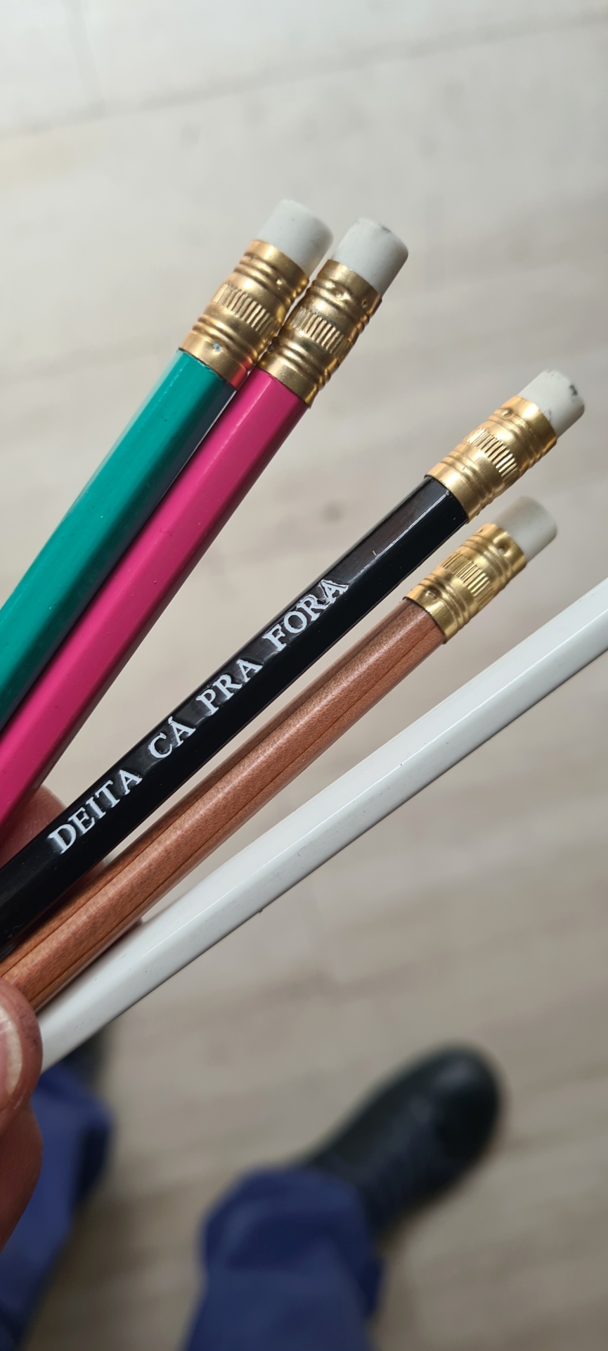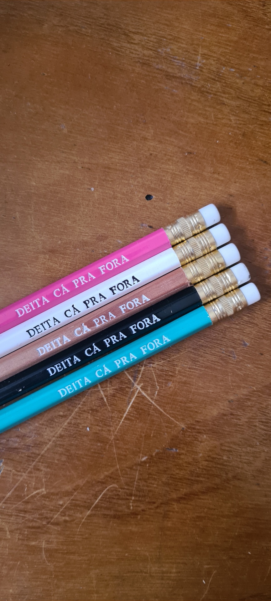 Lápis 'deita cá pra fora' (um lápis) 3,00 € Desconto de %. IVA incluído. Partilhar Cor Branco Preto Azul Turquesa Cor de Rosa Madeira Comprar Contactar 16 unidades em stock - Lápis 'deita tudo cá pra fora' - Um lapis Viarco com frase personalizada - Existem em branco, preto, cor de rosa, azul turquesa e madeira, de acosro com o stock disponível Tags lápislápiz personalizadodeita tudo cá pra foracreatividadeboas ideiaso meu diariocriativos