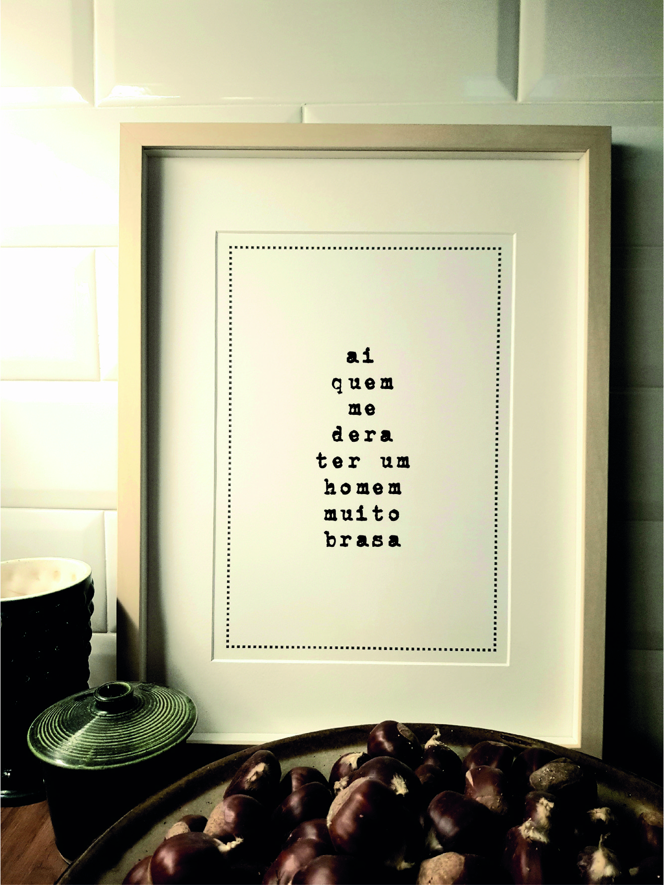 Moldura decorativa com frase em português em fundo branco rodeada por objetos e azulejos