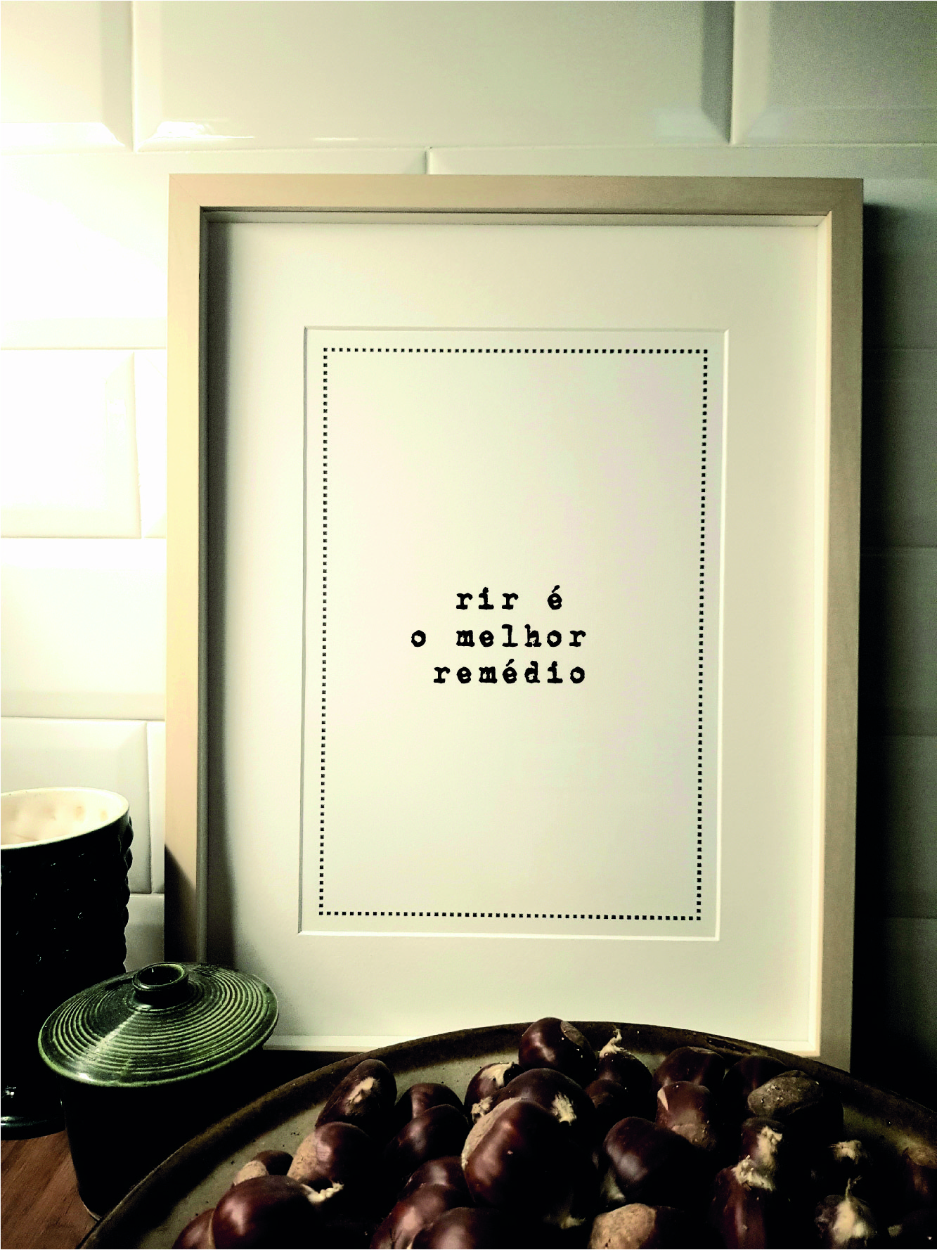 Quadro com moldura de madeira clara com texto em português 'rir é o melhor remédio' sobre mesa com castanhas e recipientes cerâmicos.