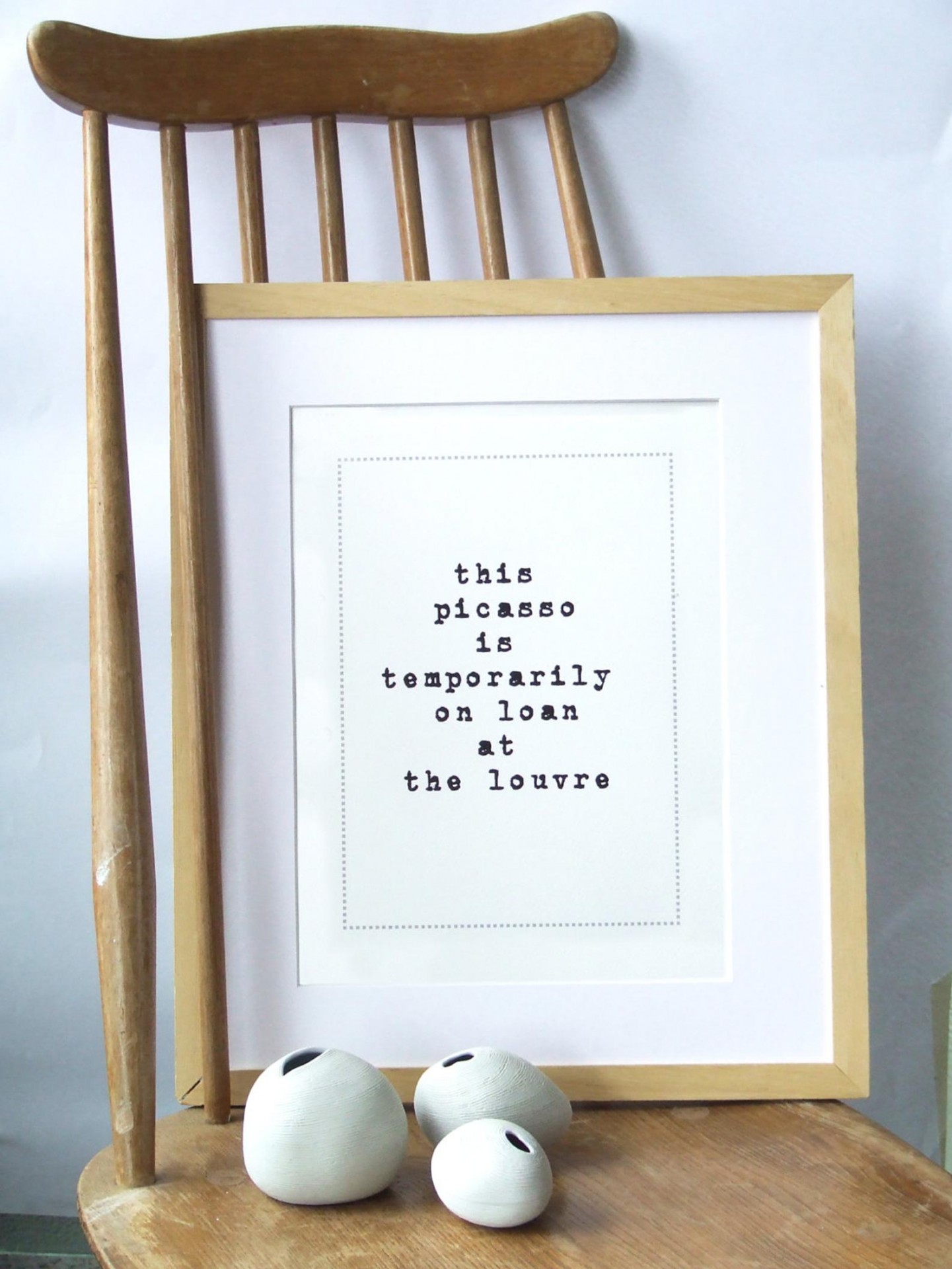 • Cadeira de madeira com moldura contendo texto e três objetos brancos