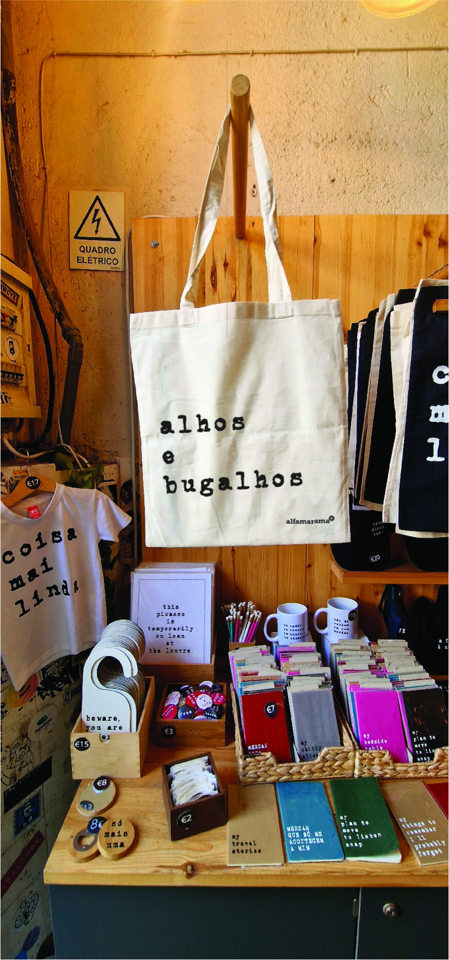 • Saco de tecido branco com texto, t-shirt branca com texto e vários produtos artesanais em bancada de madeira.