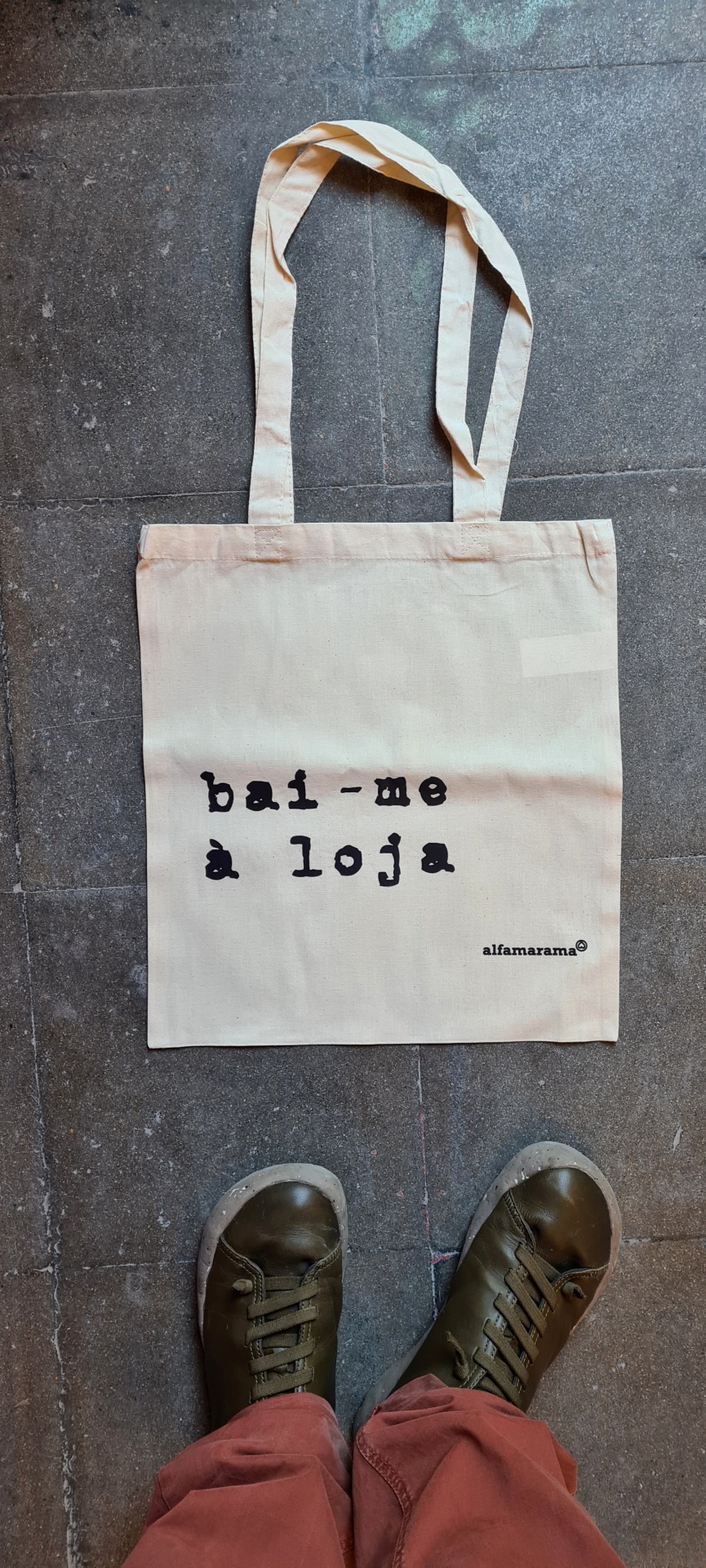 • Saco de tecido bege com texto preto 'bai-me à loja'