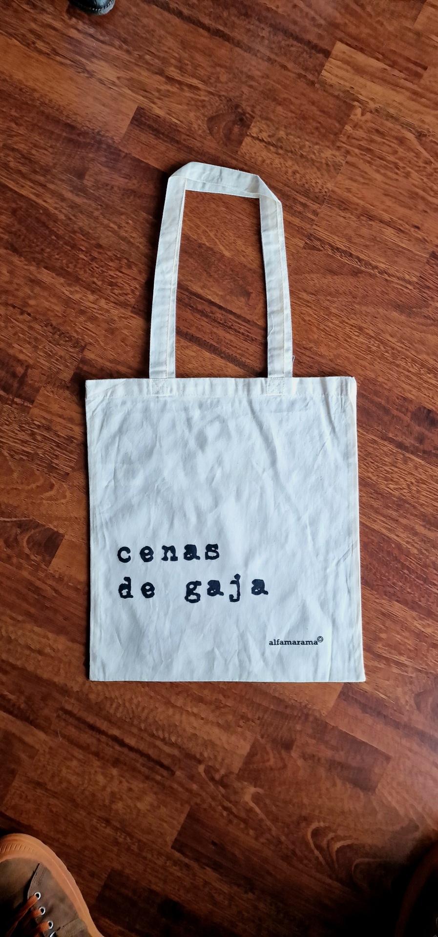 • Sacola branca com texto preto 'cenas de gaja' sobre chão de madeira.