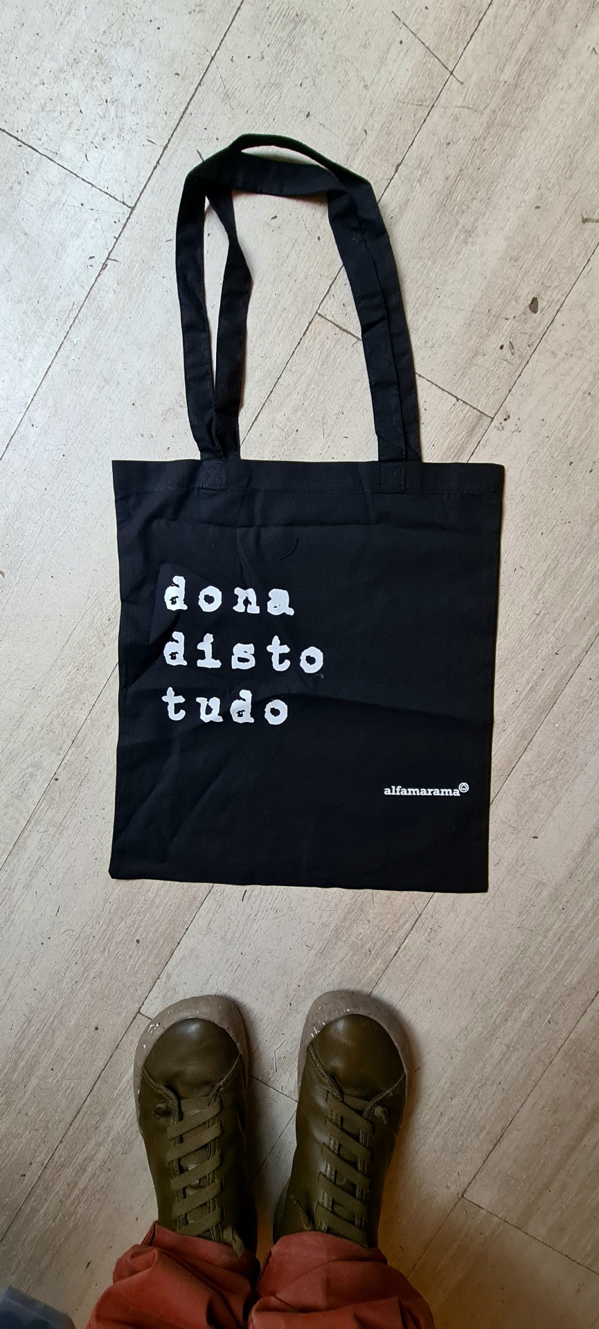 • Saco de pano preto com texto branco e alças longas sobre piso de madeira clara