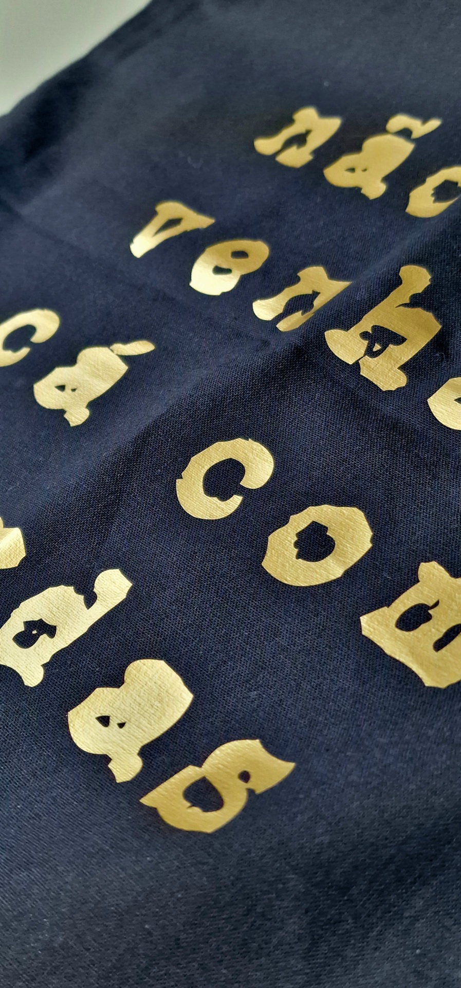 • Tecido preto com letras douradas estampadas formando palavra