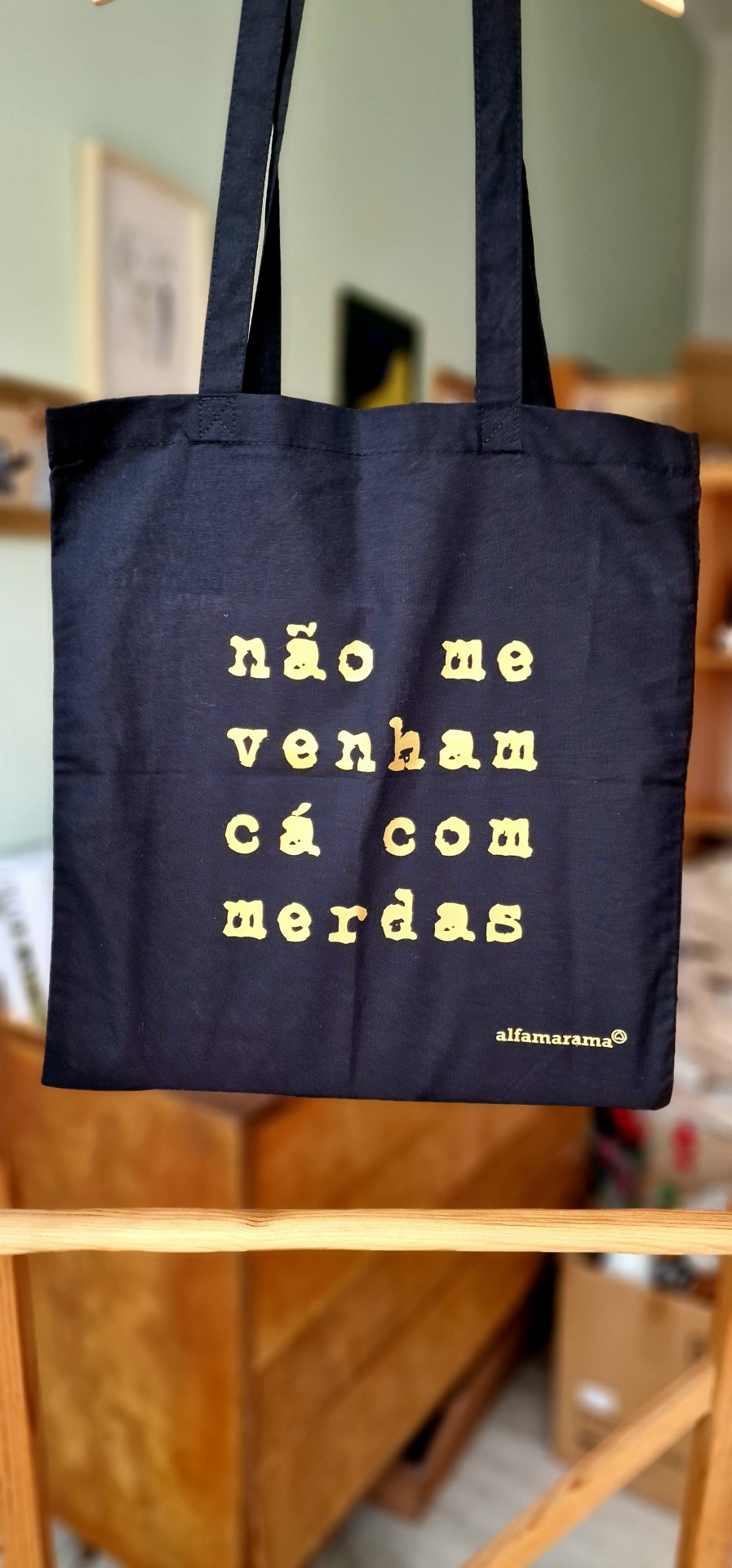 • Saco preto com texto amarelo 'não me venham cá com merdas' e marca 'alfamarama®'