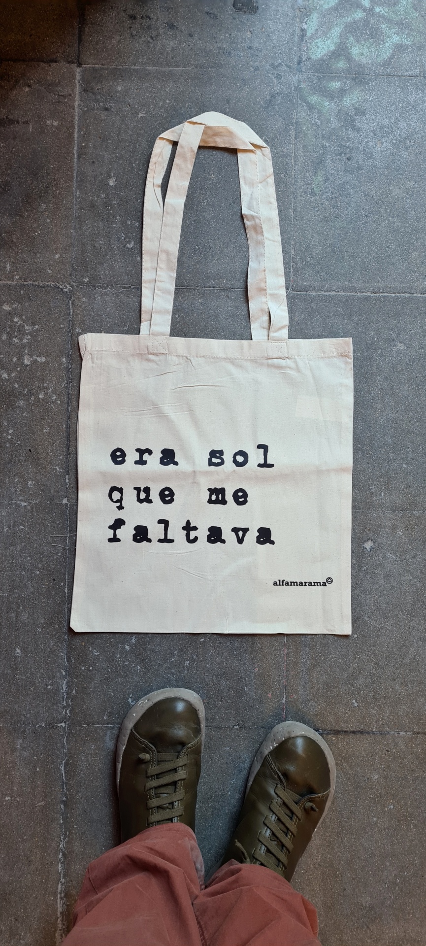 • Mala de tecido bege com frase e marca impressas