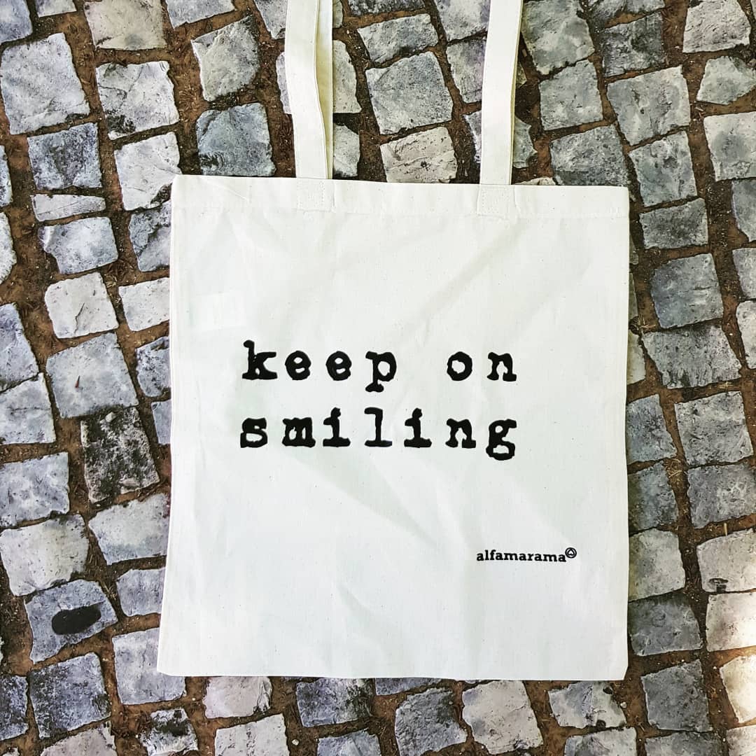 • Saco de tecido branco com texto 'keep on smiling' em letras pretas sobre pavimento de pedras.