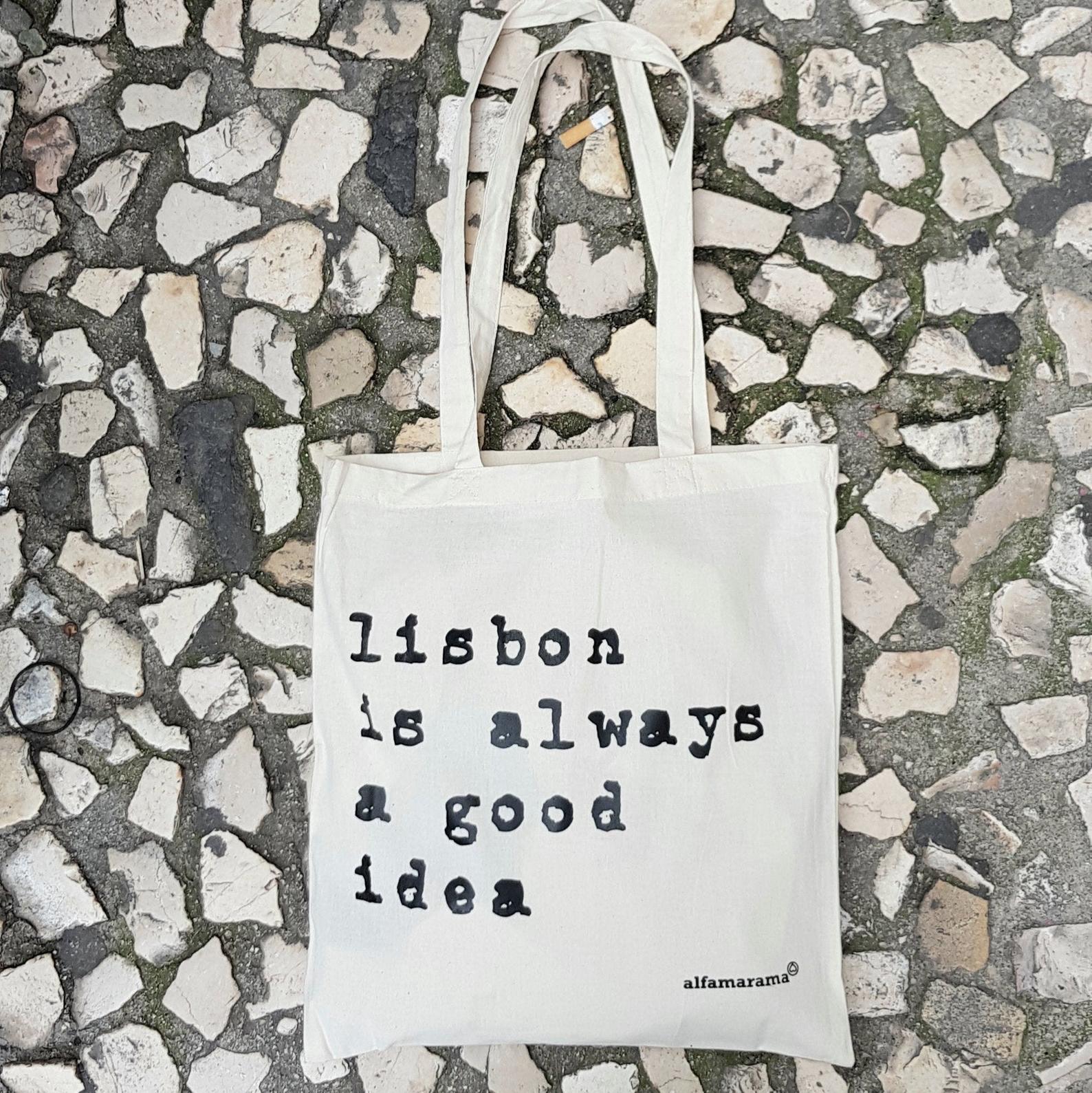• Sacola de tecido bege com texto preto sobre calçada portuguesa
