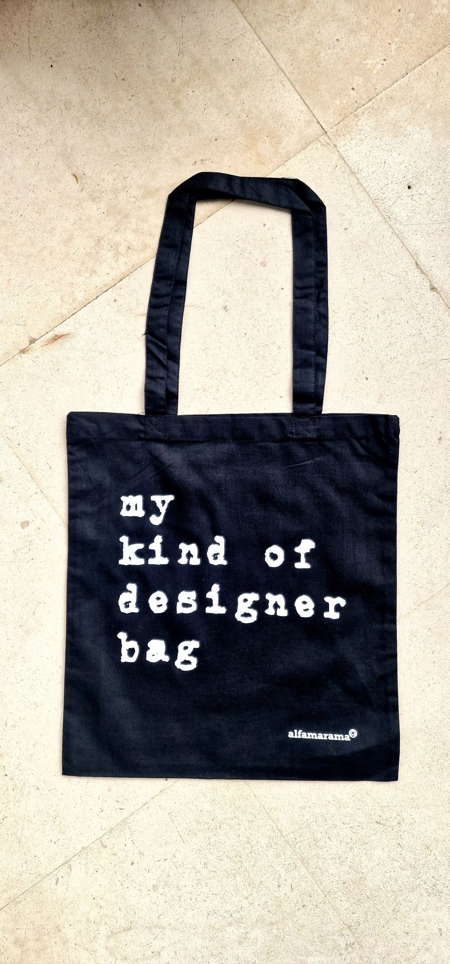 • Saco tote bag preto com texto branco e alças sobre piso de pedra claro.