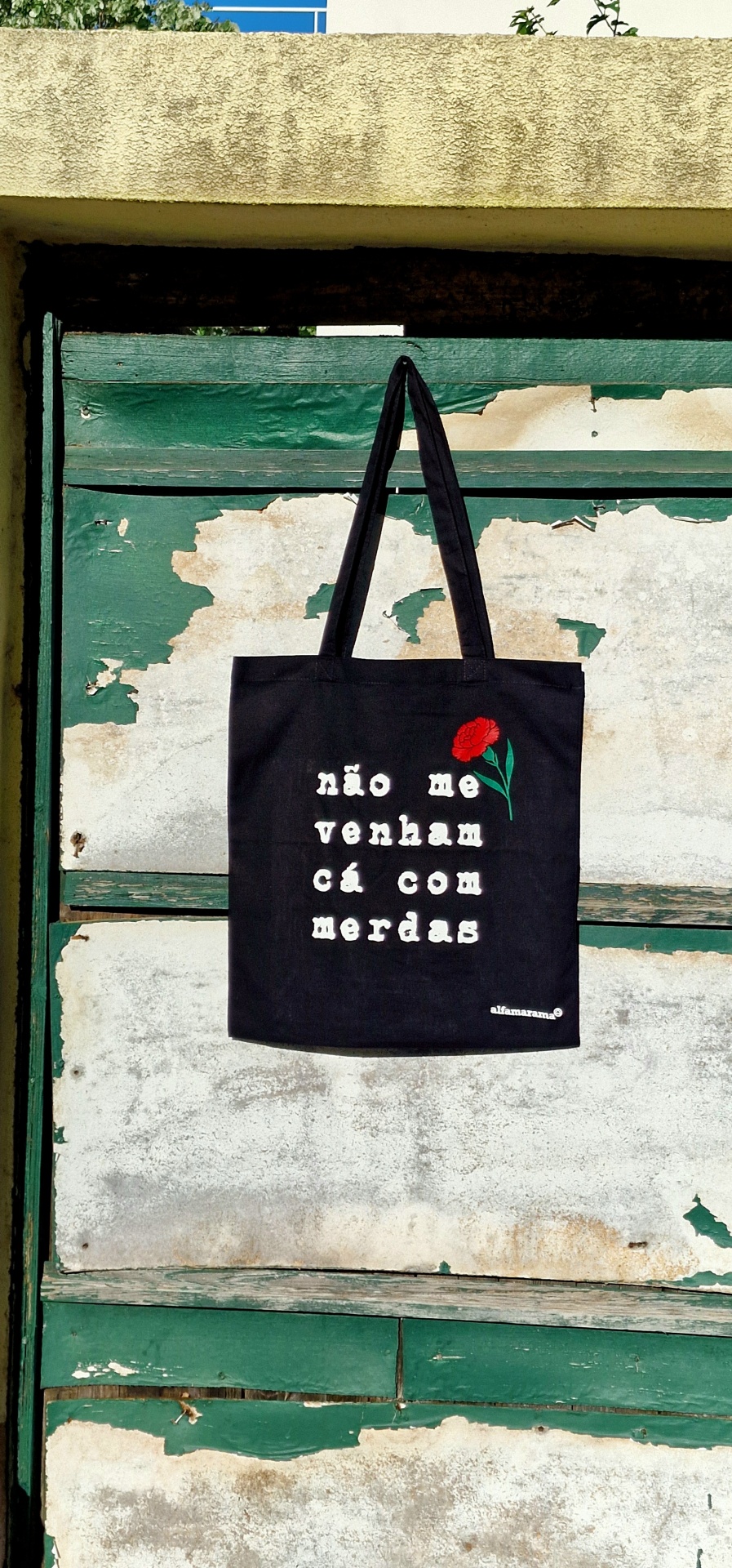 • Saco preto com texto branco e flor vermelha pendurado numa porta de madeira verde desgastada