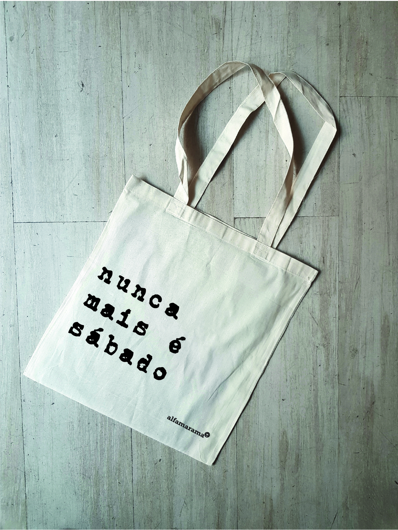 • Saco de tecido branco com texto preto 'nunca mais é sábado'
