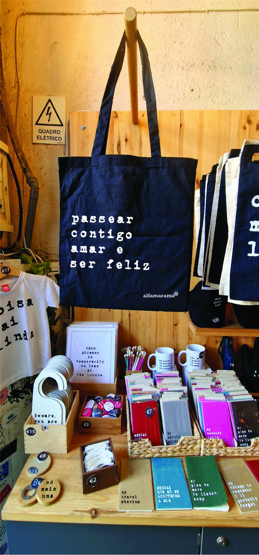 • Saco de tecido azul escuro pendurado com frase em branco numa loja com produtos variados em exposição.
