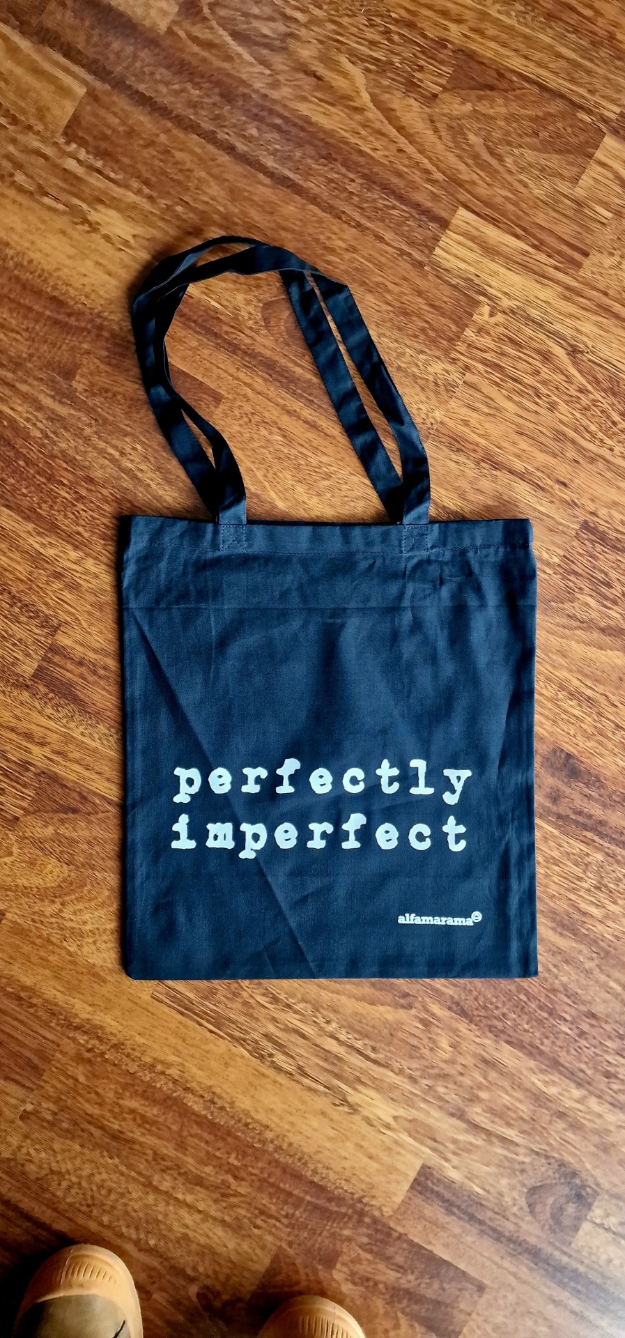 • Saco de tecido preto com texto branco 'perfectly imperfect'
