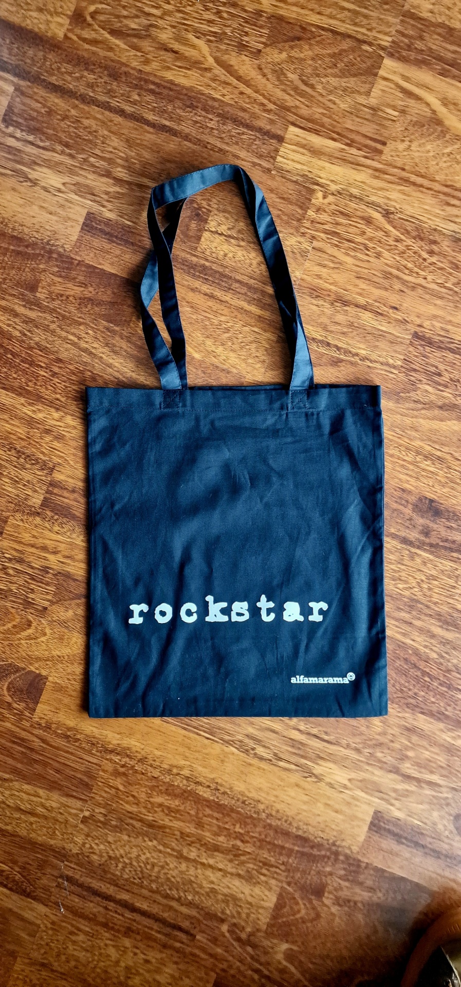 • Saco preto de tecido com a palavra 'rockstar' em branco