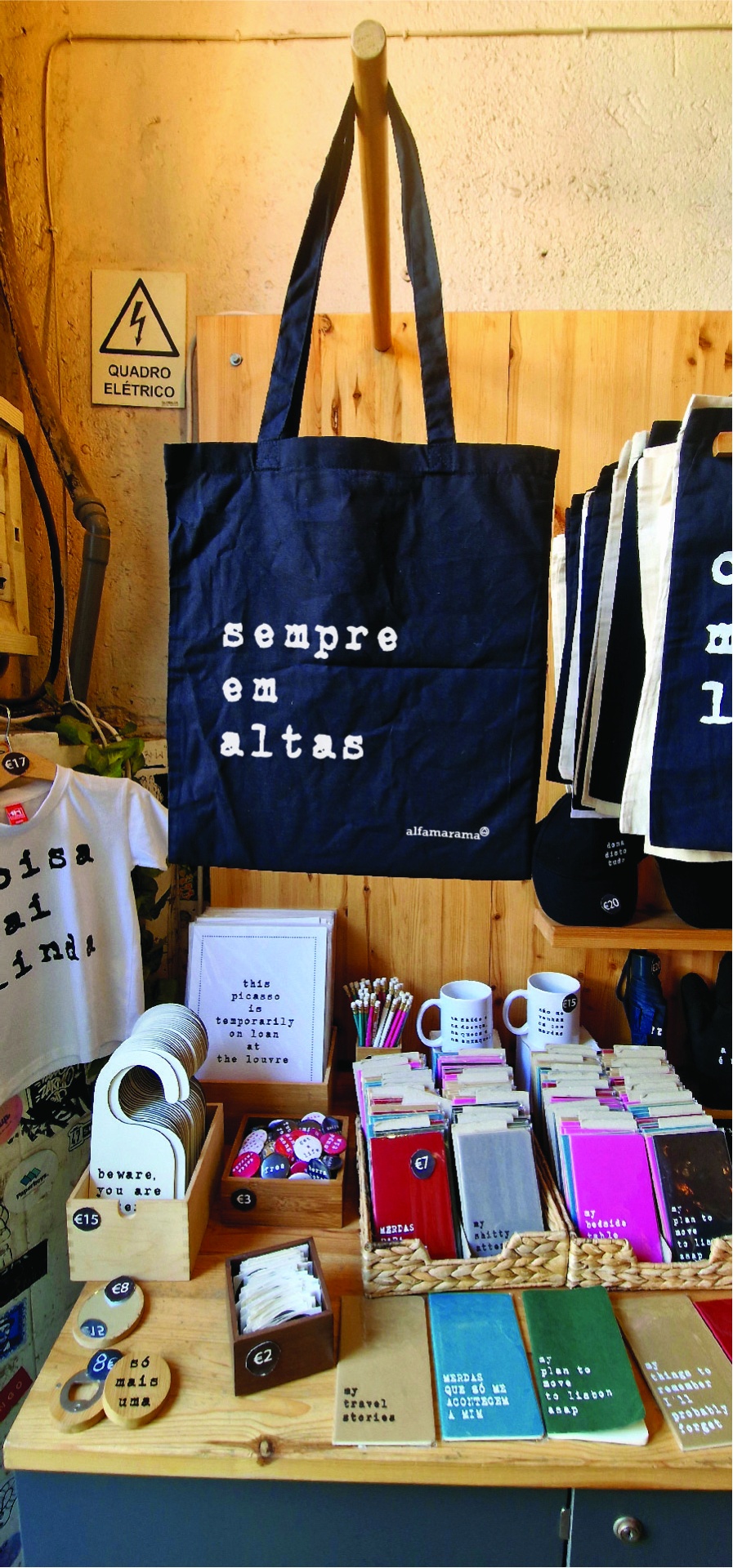 • Saco de pano azul com texto branco pendurado, rodeado por artigos de papelaria e merchandising em bancada de madeira