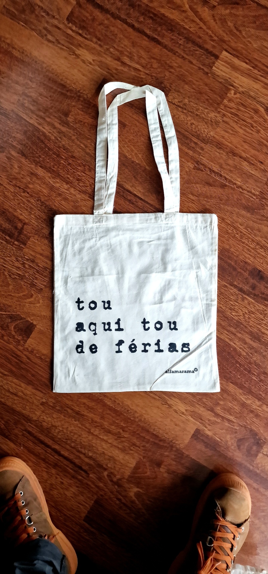 • Saco de tecido branco com texto preto pendurado em chão de madeira castanha