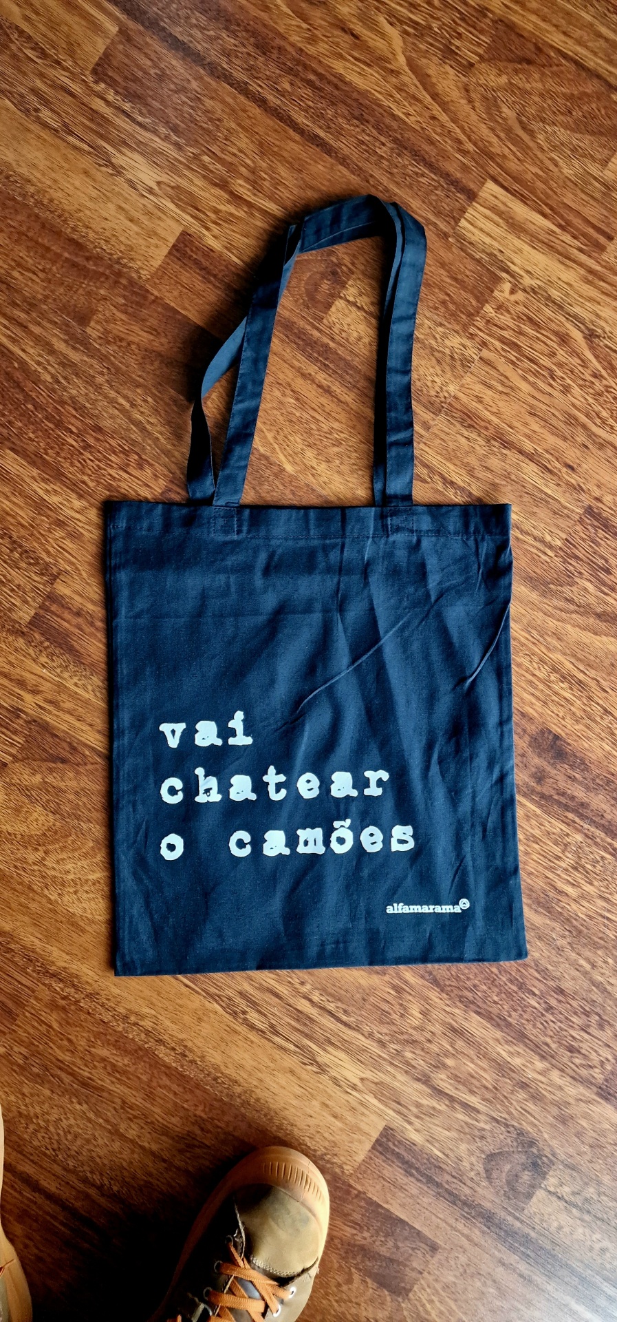 • Saco de pano azul escuro com texto branco 'vai chatear o camões'