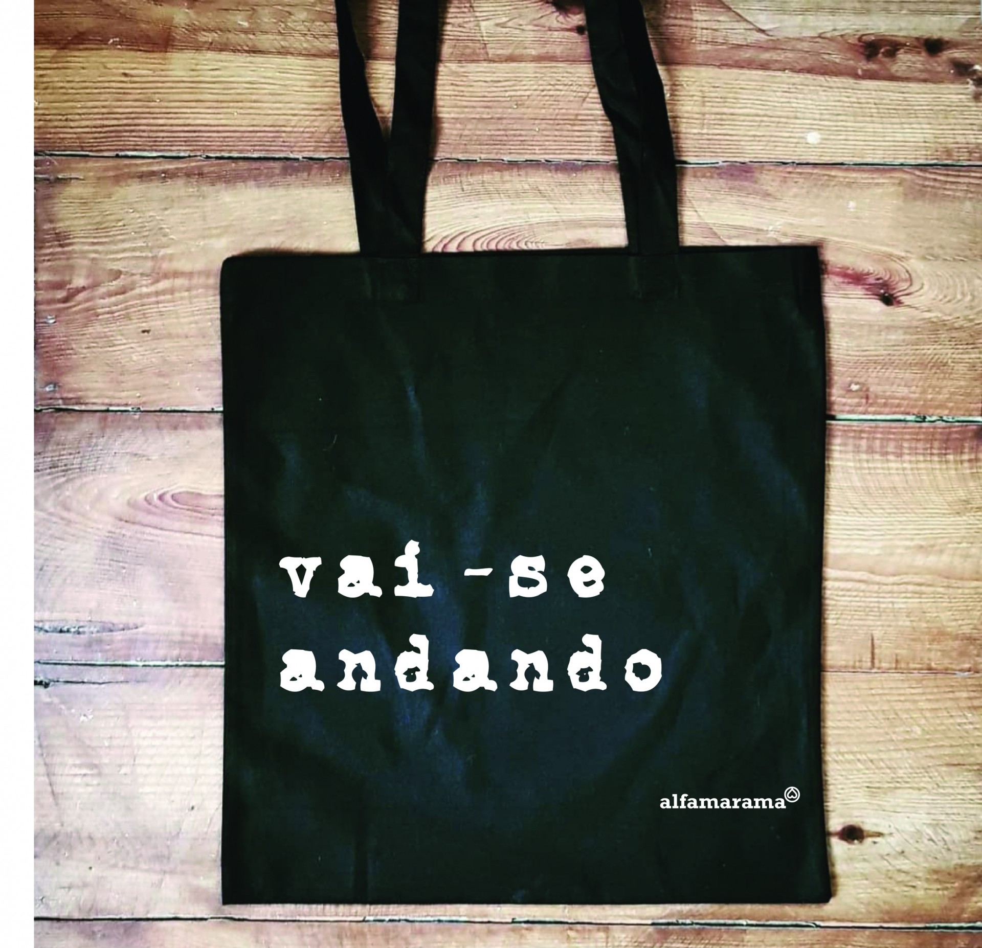 Saco de tecido preto com texto branco 'vai-se andando' e 'alfamarama®'