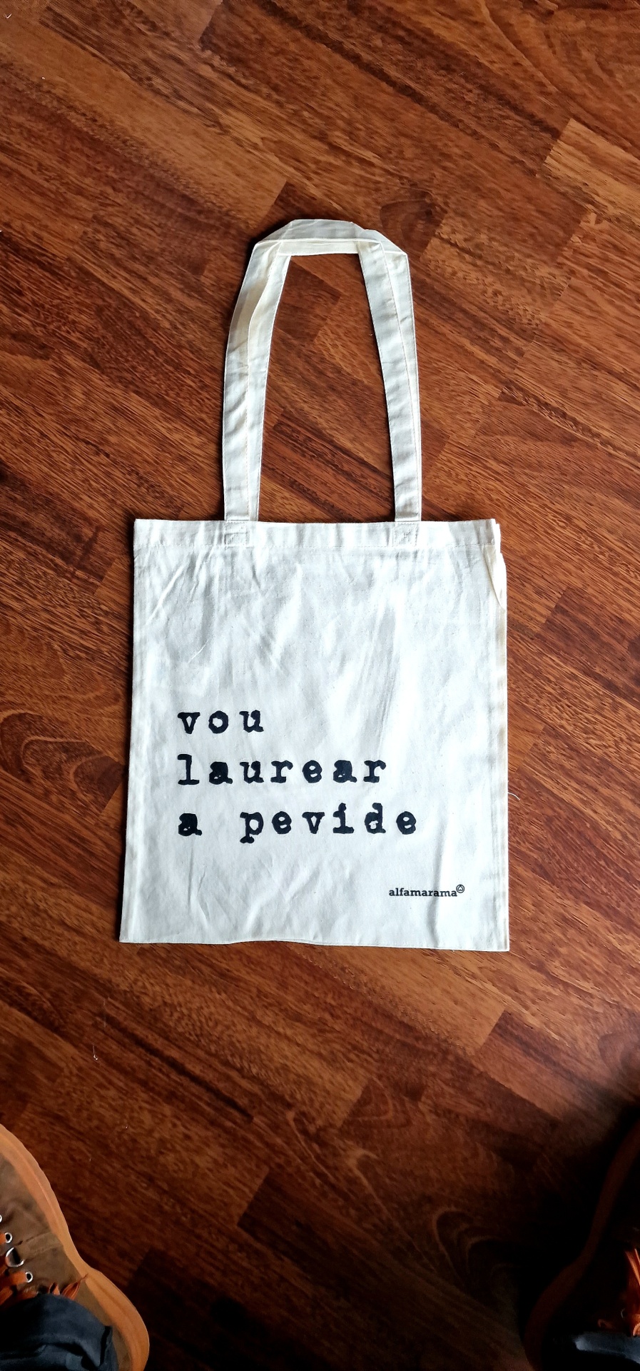 Saco de tecido branco com texto em preto sobre chão de madeira