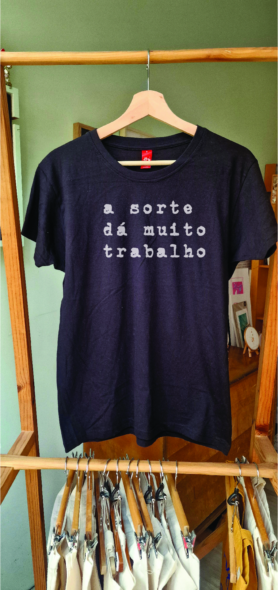 • T-shirt preta com texto em letras brancas pendurada em estrutura de madeira com sacos de tecido brancos.