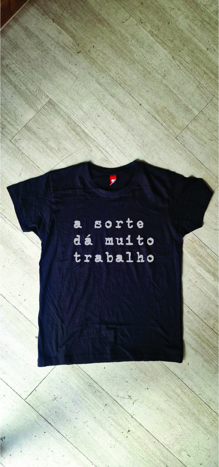• T-shirt preta com texto branco sobre chão de madeira clara