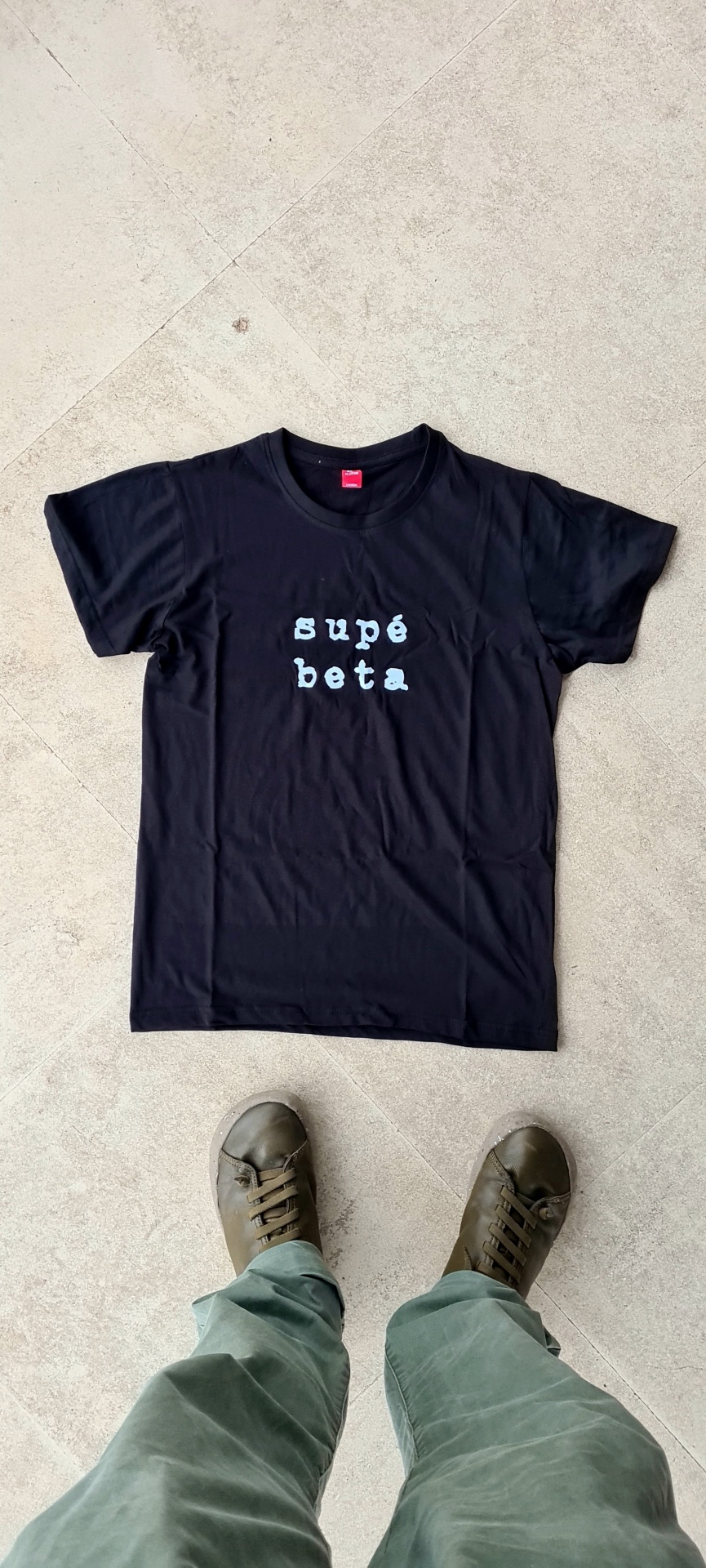 • T-shirt preta com texto branco supé beta no centro sobre piso de cimento claro
