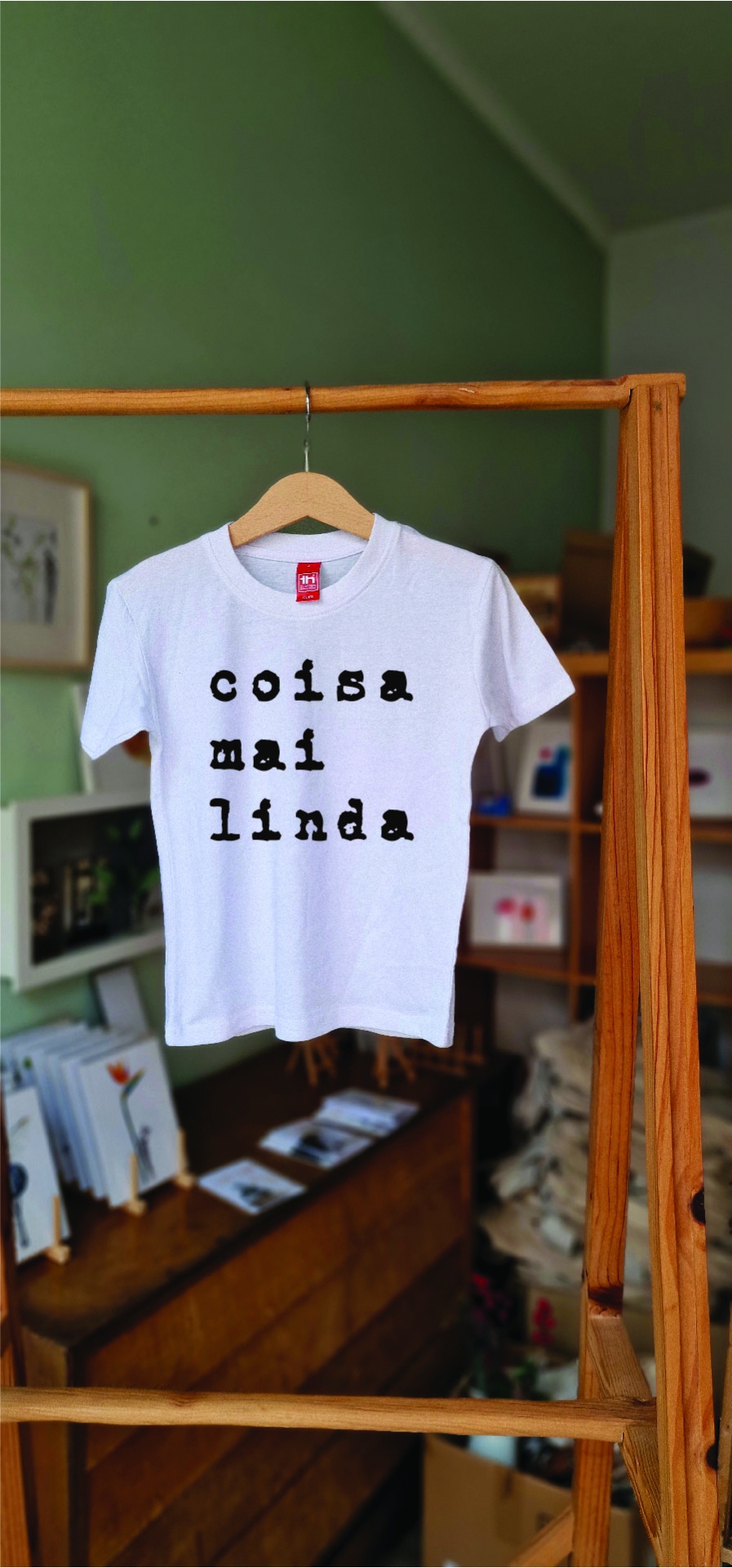 T-shirt branca com texto preto pendurada numa estrutura de madeira