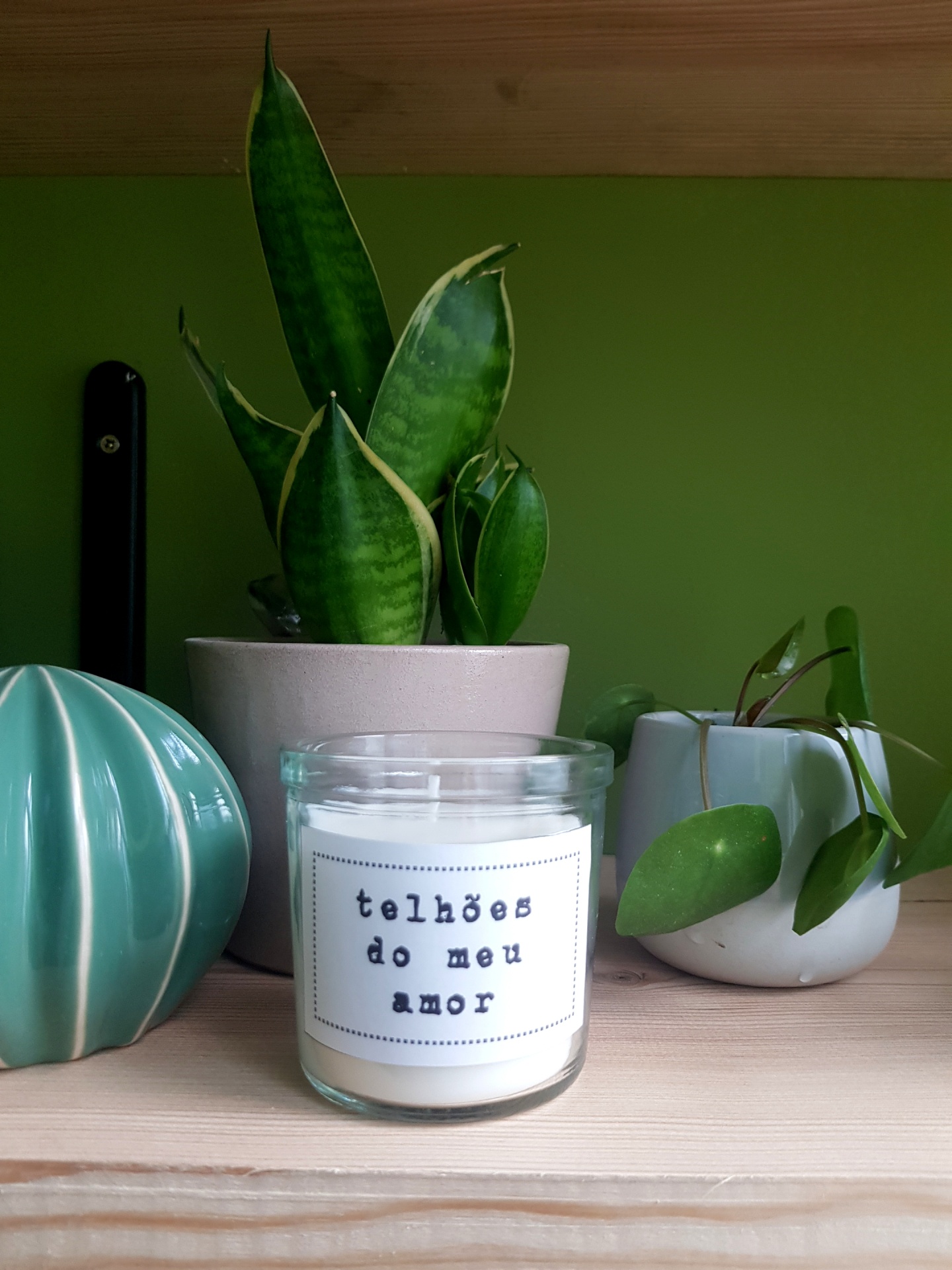 • Vela branca em copo de vidro com texto 'telhões do meu amor' na etiqueta, ao lado de vasos com plantas em prateleira de madeira
